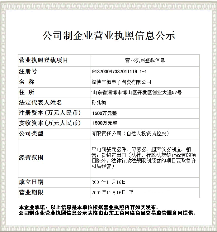 淄博宇海電子陶瓷有限公司位于淄博市博山開發(fā)區(qū)創(chuàng)業(yè)大道57號,始建于1966年,2001年11月由國營淄博無線電瓷件廠改制為淄博宇海電子陶瓷有限公司。公司是生產(chǎn)壓電陶瓷元件的專業(yè)廠家,是中國電子元件行業(yè)協(xié)會創(chuàng)始會員、山東省先進(jìn)陶瓷創(chuàng)新創(chuàng)業(yè)共同體理事單位。